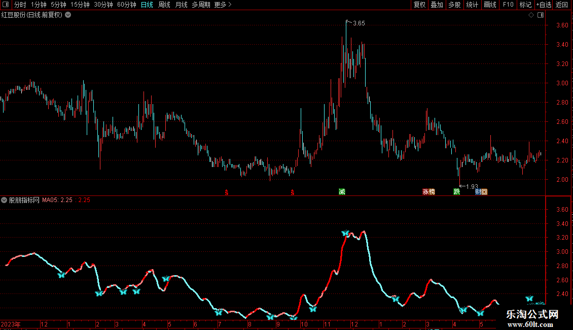 IF(X_5<0 AND MA05<REF(MA05,1),MA05,DRAWNULL),COLORFFFF80,LINETHICK3;