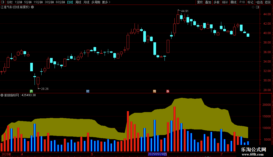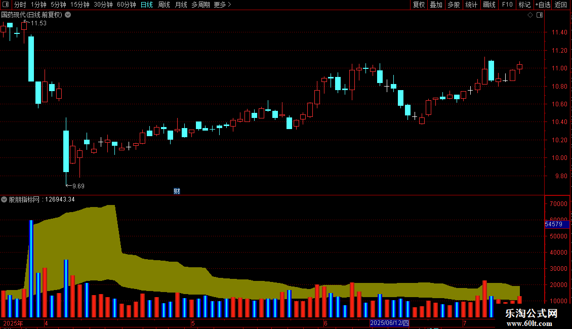 STICKLINE(CLOSE>=OPEN,0,V,1.0,0) ,COLOR1020DD;