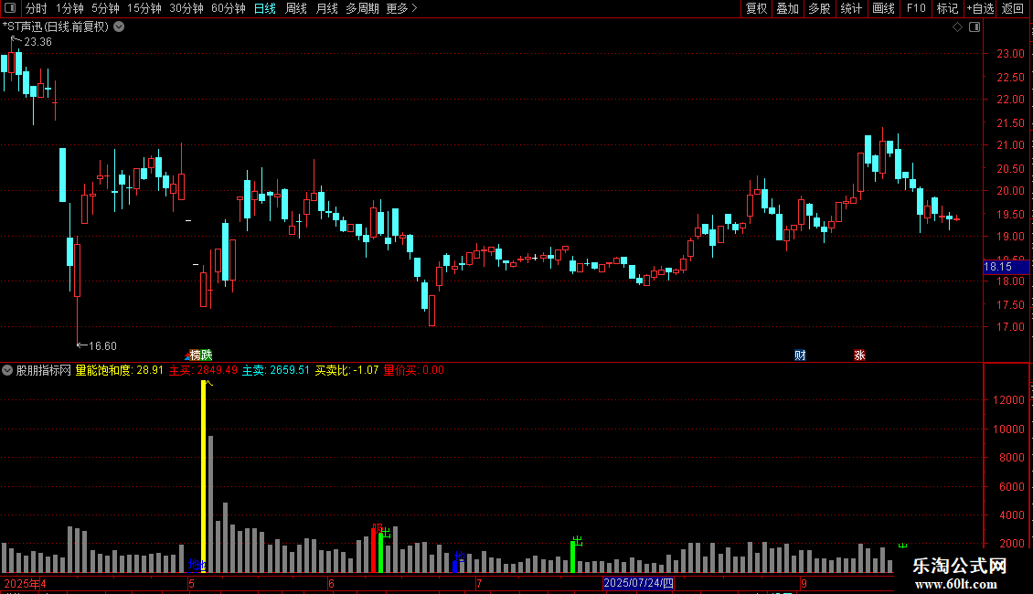 主卖:IF(CLOSE>OPEN,AA*((HIGH-CLOSE)+(OPEN-LOW)),IF(CLOSE<OPEN,AA*(HIGH-LOW),VOL /2)),COLORCYAN,POINTDOT;