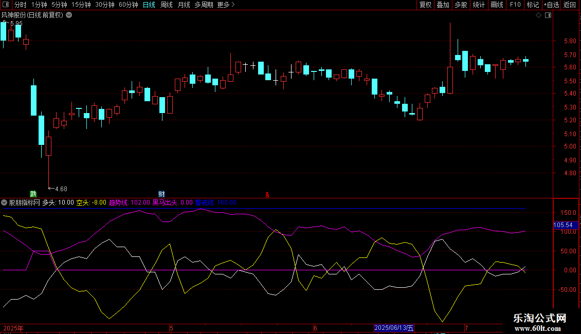 黑马出头:IF(((((CLOSE - MA(CLOSE,8)) / MA(CLOSE,8)) * 100) < (0 - 6.1)),50,0),COLORFF00FF;