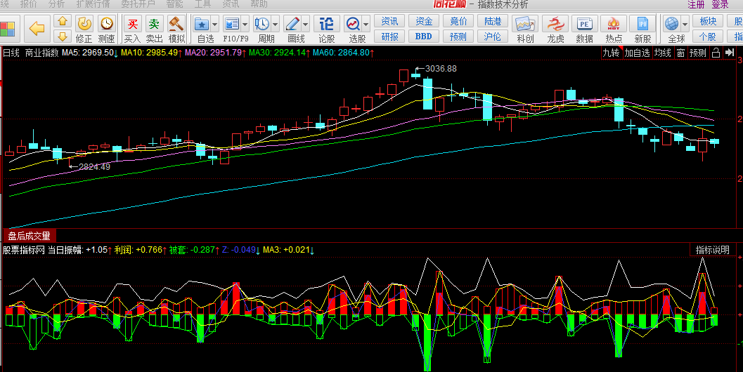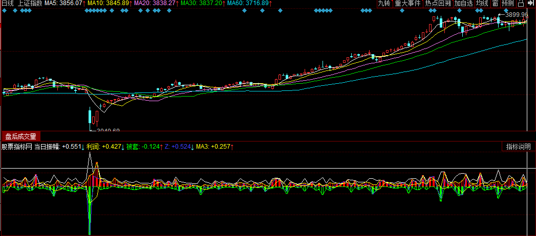 当日振幅:(HIGH-LOW)/CLOSE[1]*100;利润:(CLOSE-LOW)/CLOSE[1]*100;被套:(CLOSE-HIGH)/CLOSE[1]*100,colorgreen;STICKLINE(CLOSE>=CLOSE[1],利润,0,6,1),colorred;STICKLINE(CLOSE<CLOSE[1],利润,0,6,1),colorred;STICKLINE(CLOSE<CLOSE[1],0,被套,6,1),colorgreen;STICKLINE(CLOSE>=CLOSE[1],0,被套,6,1),colorgreen;//STICKLINE((利润-被套)>4,利润,被套,6,1),coloryellow;z:(CLOSE-CLOSE[1])/CLOSE[1]*100;STICKLINE(CLOSE>=CLOSE[1],z,0,6,0),colorred;STICKLINE(CLOSE<CLOSE[1],z,0,6,0),colorgreen;MA3:MA(z,3);//z1:=IF(z>0,z,-z);//POLYLINE(z1>=HHV(z1,4),z);