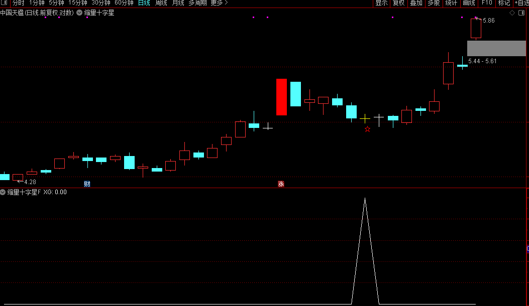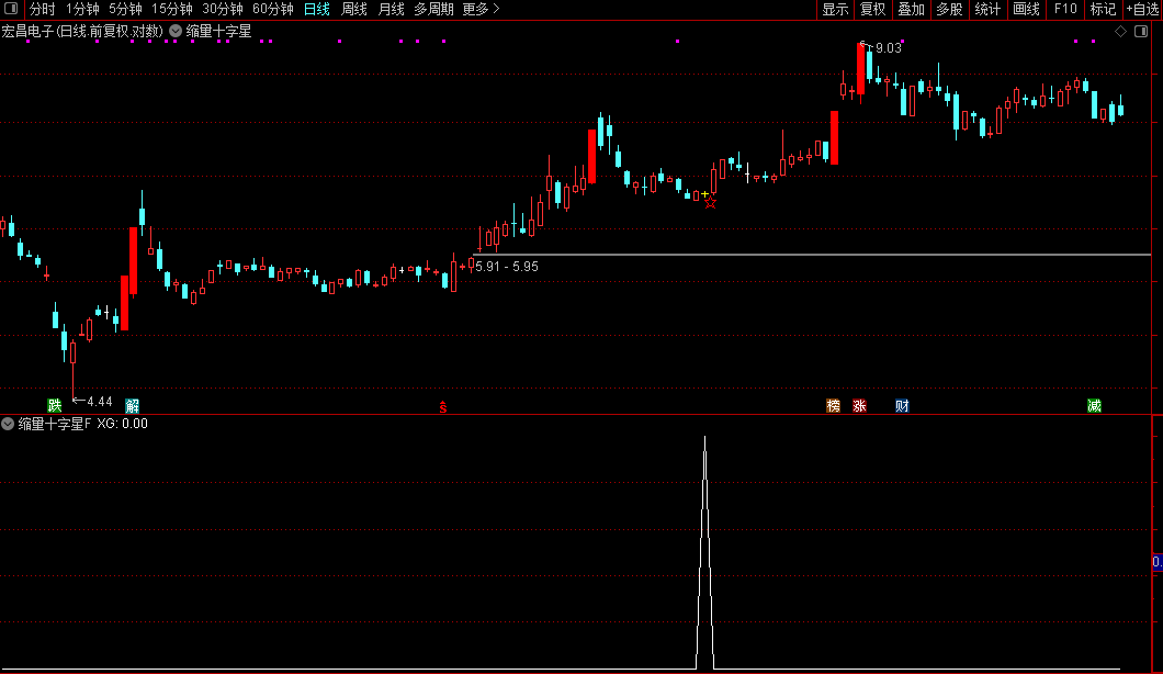 当系统检测到以上条件全部满足时,为了提供直观的视觉信号,主图会显示黄色十字星且下方有红色五角星。这个红色五角星位置就是选股指标要选出的标的,提示用户重点关注。