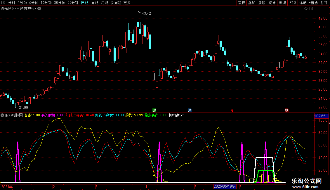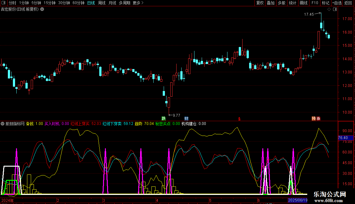 买入时机: IF(CROSS(J,3),65,0),COLORFF00FF,LINETHICK3;