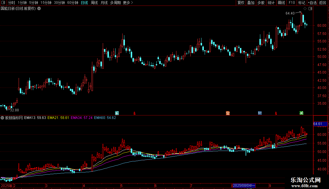 STICKLINE(X2<X3 AND C<EMA13,CLOSE,OPEN,3,0),COLORFFFF52;