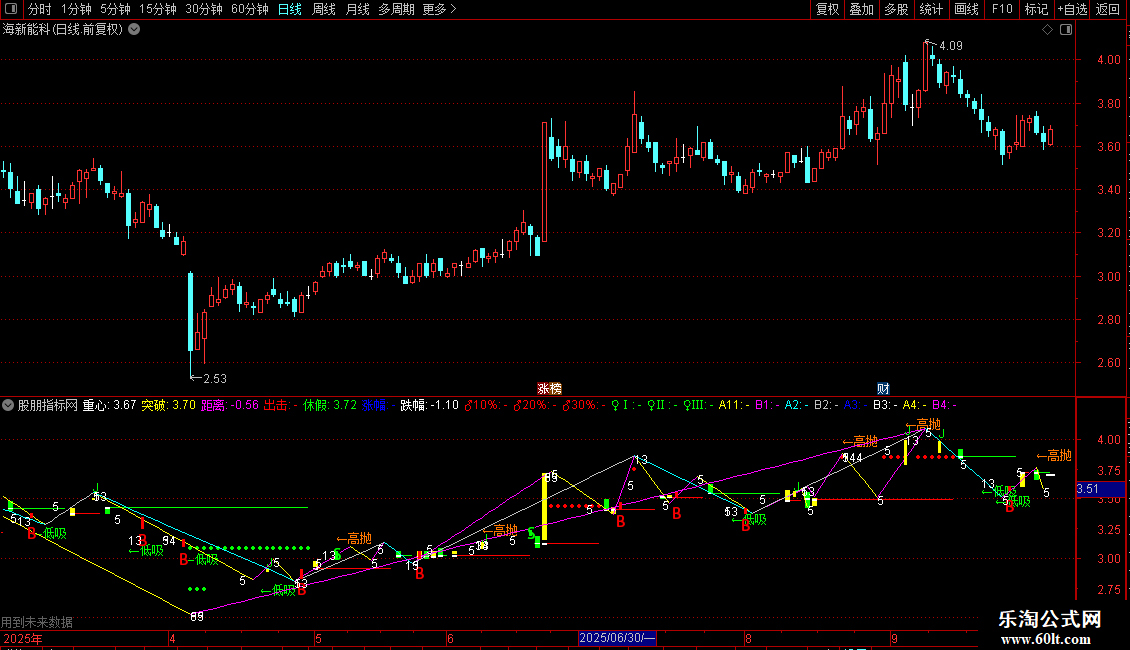 输出B4:当满足条件最低价<=55日内最低价的最低值时,在最低价位置画直线起点,当满足条件最高价>=55日内最高价的最高值时,在最高价位置画直线终点,0表示是否延长.