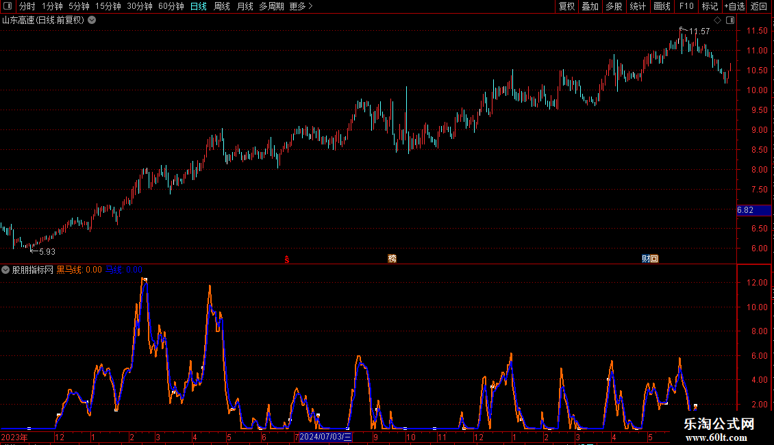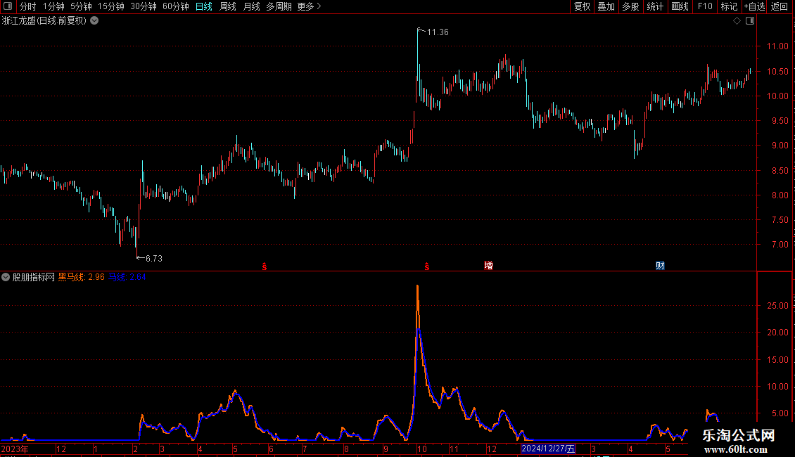 黑马线:IF(LS28>0.1,LS29,0)*5,COLOR0066FF,LINETHICK2;