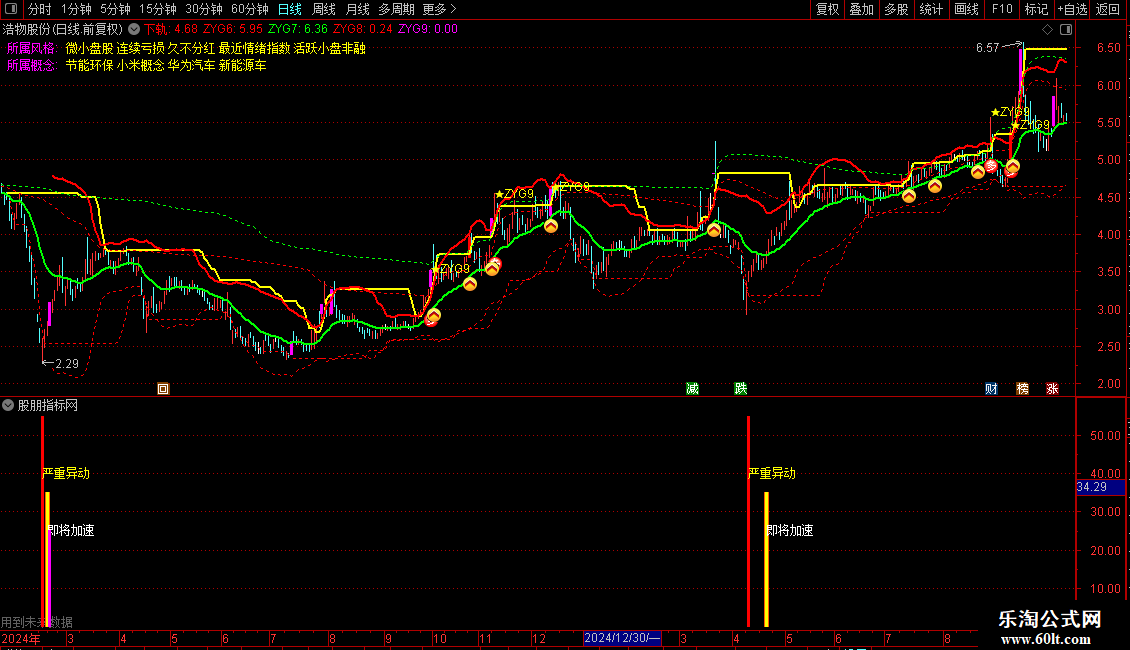 指标通过计算多周期均线偏离度和成交量变化,识别价格异动和趋势加速信号。操作策略上:当价格连续多日低于32日均线后出现放量突破时,标记为严重异动(蓝色柱状图);当短期动能指标上穿中线且成交量放大时,提示即将加速(白色文字);若同时满足均线金叉和超跌条件,则显示短线加仓提示(粉色柱状图)。整体通过颜色区分不同级别的趋势强度,辅助判断买卖时机。