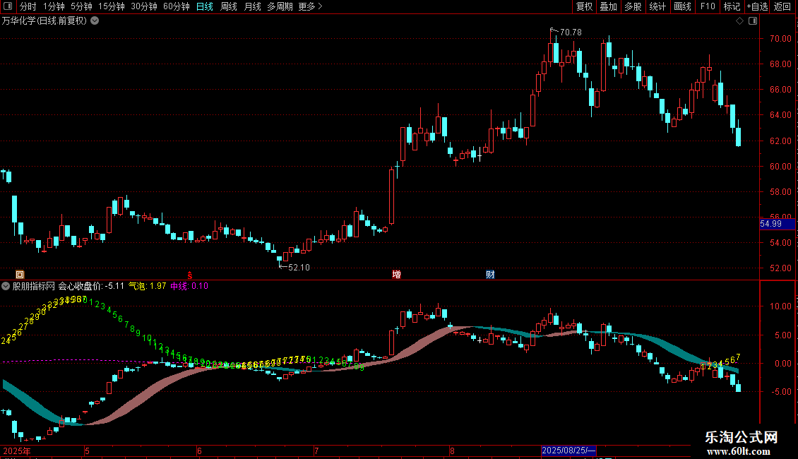 VAR1Z:=REF(MA(C,20),10);开:=O-VAR1Z,NODRAW;高:=H-VAR1Z,NODRAW;低:=L-VAR1Z,NODRAW;会心收盘价:C-VAR1Z,NODRAW;MID:=(3*会心收盘价+低+开+高)/6;红线:=(20*MID+19*REF(MID,1)+18*REF(MID,2)+17*REF(MID,3)+16*REF(MID,4)+15*REF(MID,5)+14*REF(MID,6)+13*REF(MID,7)+12*REF(MID,8)+11*REF(MID,9)+10*REF(MID,10)+9*REF(MID,11)+8*REF(MID,12)+7*REF(MID,13)+6*REF(MID,14)+5*REF(MID,15)+4*REF(MID,16)+3*REF(MID,17)+2*REF(MID,18)+REF(MID,20))/210,COLORLIRED;绿线:=MA(红线,6),COLORLIGREEN;X1:=ABS(红线)/0.9,COLORBROWN;气泡:IF(红线<=0,X1,DRAWNULL),COLORYELLOW,NODRAW;中线:IF(红线<0,(X1+红线)/2,DRAWNULL),COLORMAGENTA,DOTLINE;DRAWBAND(绿线,RGB(0,124,124),红线,RGB(155,96,96));DRAWKLINE(高,开,低,会心收盘价);ZP:=红线<=0 AND 气泡>REF(气泡,1);天数:DRAWNUMBER(ZP,气泡,BARSLAST(REF(红线,1)>0 AND 红线<0)),COLORYELLOW;ZP1:=红线<=0 AND 气泡<REF(气泡,1);天数1:DRAWNUMBER(ZP1,气泡,BARSLAST(REF(气泡>REF(气泡,1),1) AND 气泡<REF(气泡,1))),COLORGREEN;