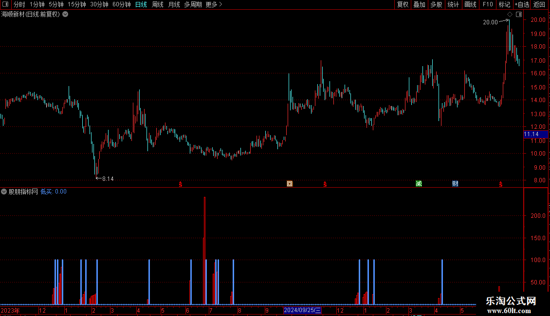 低买:IF((CROSS(洗盘,主力进场)AND 买入=-20),100,0),STICK,COLORFF9150,LINETHICK3;