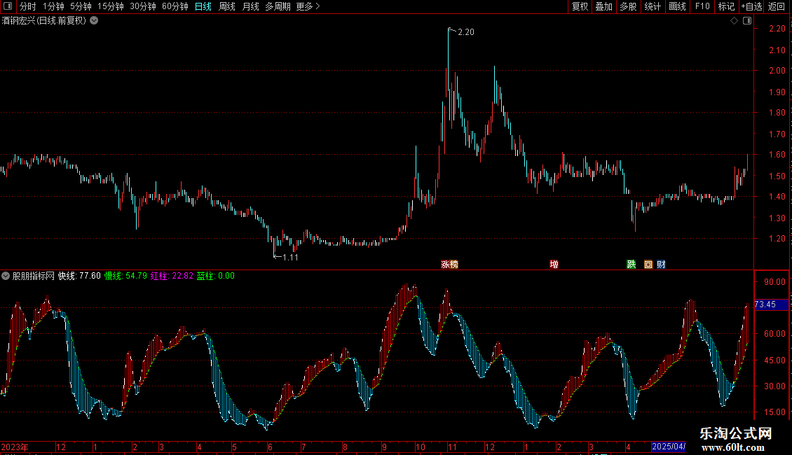 STICKLINE(((快线 - 慢线) > 0),快线,慢线,0.05,-1),COLORRED;