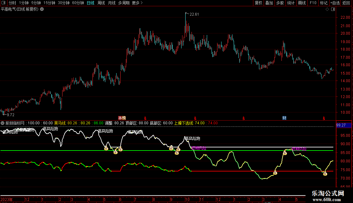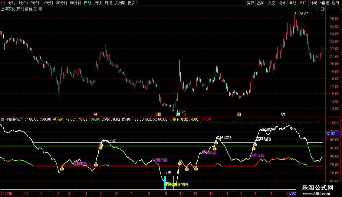 DRAWTEXT(VAR9 AND VAR7<88,调整,'短期风险'),COLORF00FF0;
