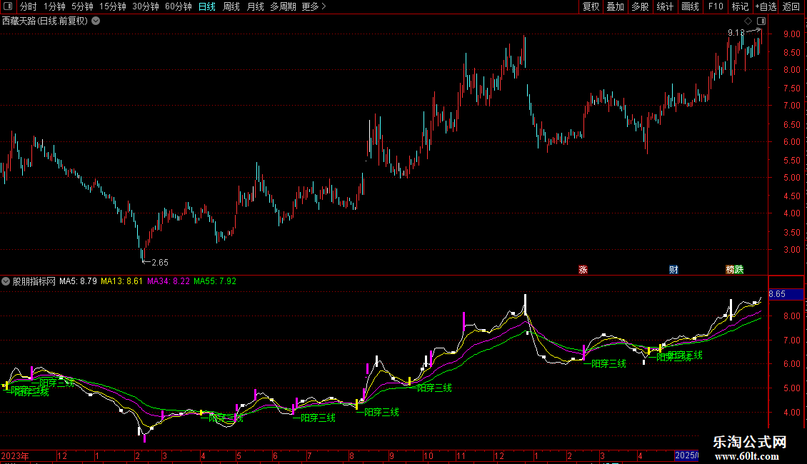 DRAWTEXT(一阳穿三线,L-0.1, '一阳穿三线'),COLORGREEN;
