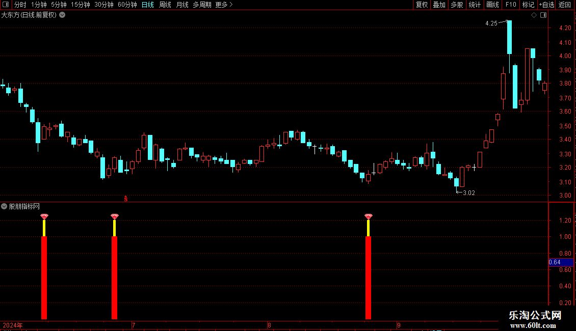 注:指标通过叠加短、中、长周期超卖状态,避免单一周期误判;黄色柱体为初步警示,红色柱体+三角图标为确认信号,建议结合日线成交量及板块效应验证。