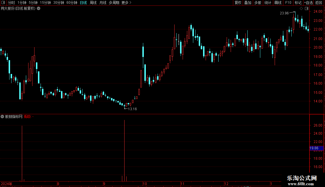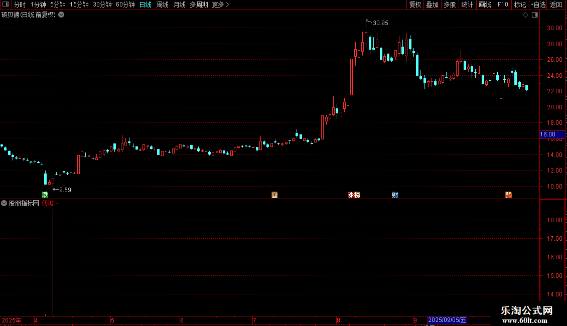 低吸:IF(TJ > 10, EMA(IF(LOW <= VARE , (VARD + VARF * 2) / 2, 0), 3) / 618 * VAR10 * 0.5, DRAWNULL), COLORSTICK, COLORRED;