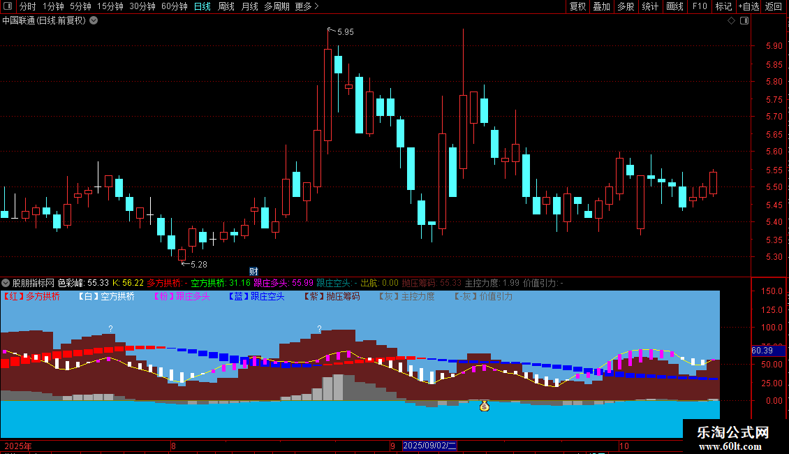 跟庄空头:IF(K<=D,D,DRAWNULL),NODRAW,COLORLICYAN;