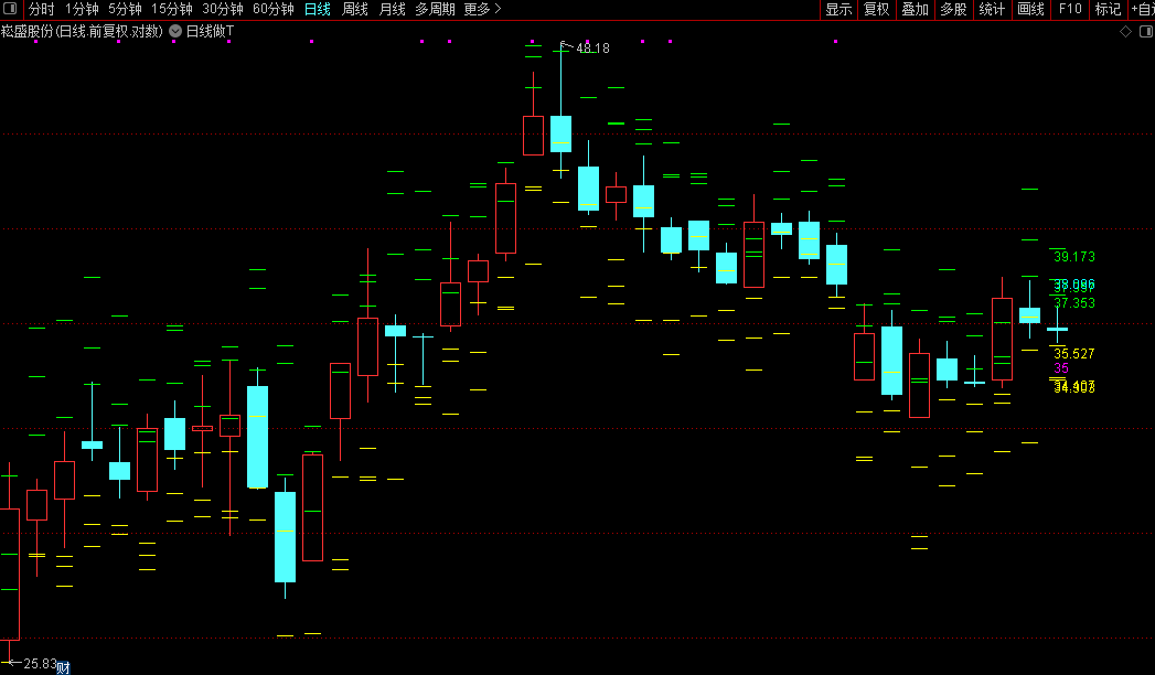 以这只为例,左边圈黄进,不到绿数字不出。如下图。直观一点提示。看指标使用方法:黄低进,到绿出. 点数字46,可埋单在次日价位大家细细体会,分步建仓,分步做T.