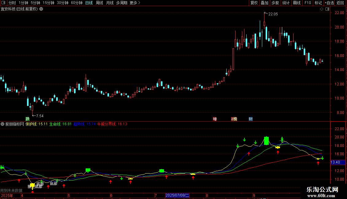 DRAWICON((ZIG(3,5)>REF(ZIG(3,5),1)) AND (REF(ZIG(3,5),1)<=REF(ZIG(3,5),2)) AND (REF(ZIG(3,5),2)<=REF(ZIG(3,5),3)),LOW*0.98,1) ;DRAWICON((ZIG(3,5)<REF(ZIG(3,5),1)) AND (REF(ZIG(3,5),1)>=REF(ZIG(3,5),2)) AND (REF(ZIG(3,5),2)>=REF(ZIG(3,5),3)),HIGH*1.01,2);VAR3:=(CLOSE-MA(CLOSE,6))/MA(CLOSE,6)*100;VAR4:=(CLOSE-MA(CLOSE,24))/MA(CLOSE,24)*100;VAR5:=(CLOSE-MA(CLOSE,32))/MA(CLOSE,32)*100;VAR6:=(VAR3+VAR4+VAR5)/3;VAR7:=EMA(VAR6,5);ZB:=EMA(EMA(VAR3,5),5)*3, COLORSTICK;VAR8:=IF(VAR6<=-20,10,0);VAR9:=HHV(VAR8,10);VARA:=IF(VAR9 AND CROSS(MA(CLOSE,3),MA(CLOSE,5)),20,0);K:=EMA(VAR7,5)*2, , COLORFF00FF;D:=EMA(K,5), , colorwhite;J:=K*3-D*2, ,coloryellow;VARB:=BETWEEN(CLOSE,MA(CLOSE,3),MA(CLOSE,5)) AND J>10;HS:=VOL/CAPITAL*100, , colorgreen;DRAWTEXT(VAR8=10 AND FILTER(VAR8=10,5),LOW*0.93,'接近底部');DRAWTEXT(VARA=20,LOW*0.95,'底部');保护线:MA(C,3),coloryellow;生命线:MA(C,21),colorgreen;趋势线:MA(C,12),colorblue; 牛熊分界线:MA(C,55),colorred; VAR1:=ZIG(3,10)<REF(ZIG(3,10),1) AND REF(ZIG(3,10),1)>REF(ZIG(3,10),2); VAR2:=ZIG(3,10)>REF(ZIG(3,10),1) AND REF(ZIG(3,10),1)<REF(ZIG(3,10),2);STICKLINE(VAR1,C,O,8,0),colorgreen,LINETHICK2;STICKLINE(VAR1,C,O,3,0),colorgreen,LINETHICK2; STICKLINE(VAR1,H,L,1,0),colorgreen,LINETHICK2; STICKLINE(VAR2,C,O,8,0),coloryellow,LINETHICK2; STICKLINE(VAR2,C,O,3,0),coloryellow,LINETHICK2; STICKLINE(VAR2,H,L,1,0),coloryellow,LINETHICK2;