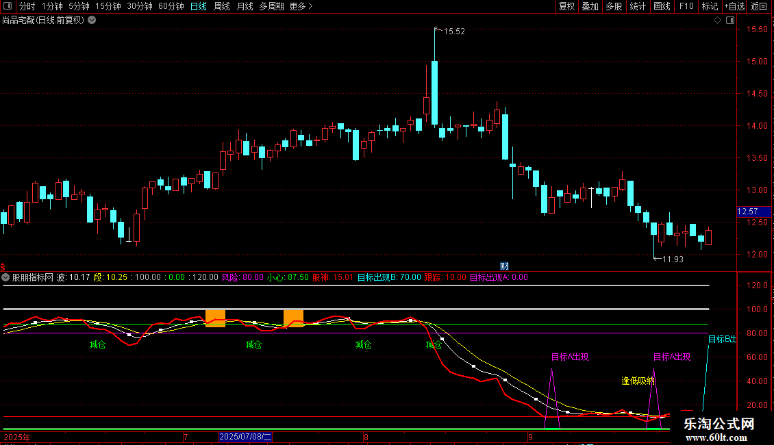 DRAWTEXT(CROSS(股海,90) AND (股神<40),75,'目标B出现'),COLORFFFF00;