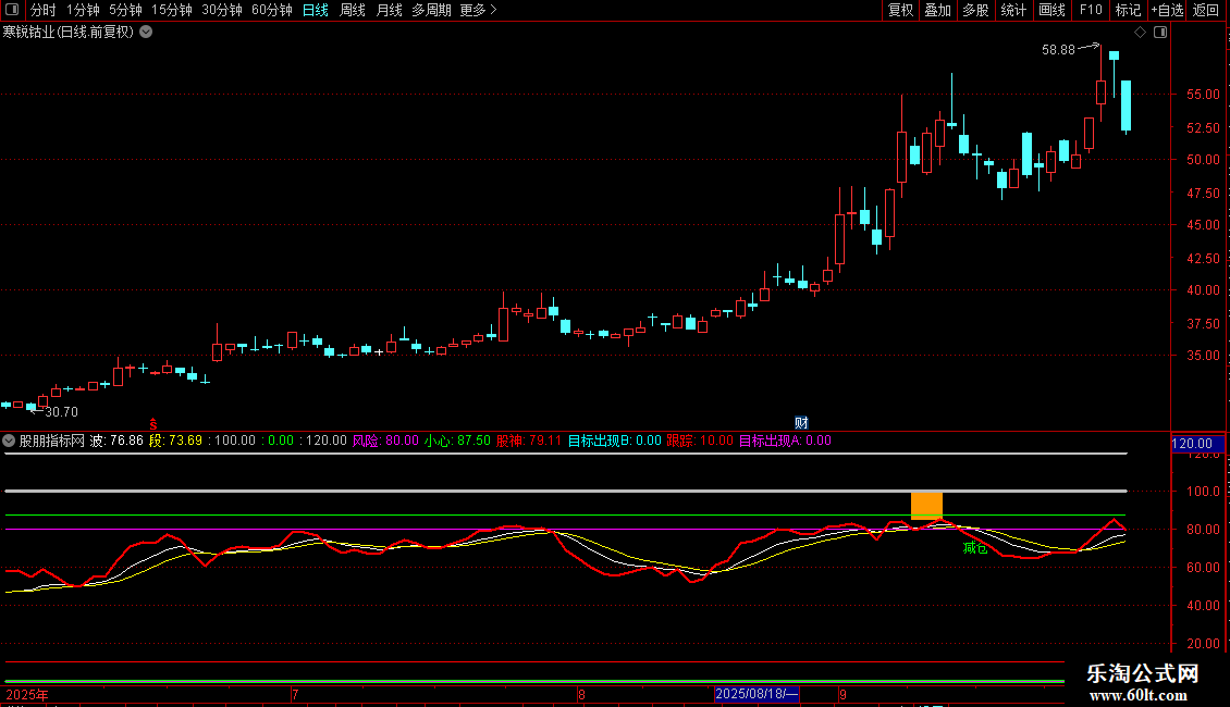 目标出现A:IF((COUNT((股神>REF(股神,1)),1)=1) AND (REF(股神,1)<REF(REF(股神,1),1)) AND (股神<跟踪),50,0),COLORF00FF0;