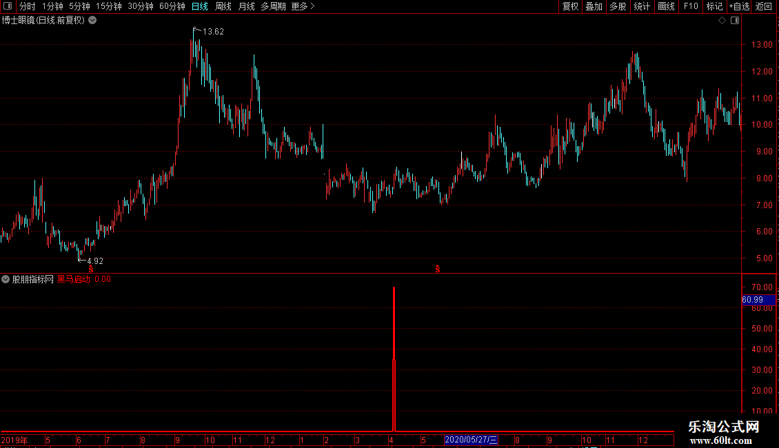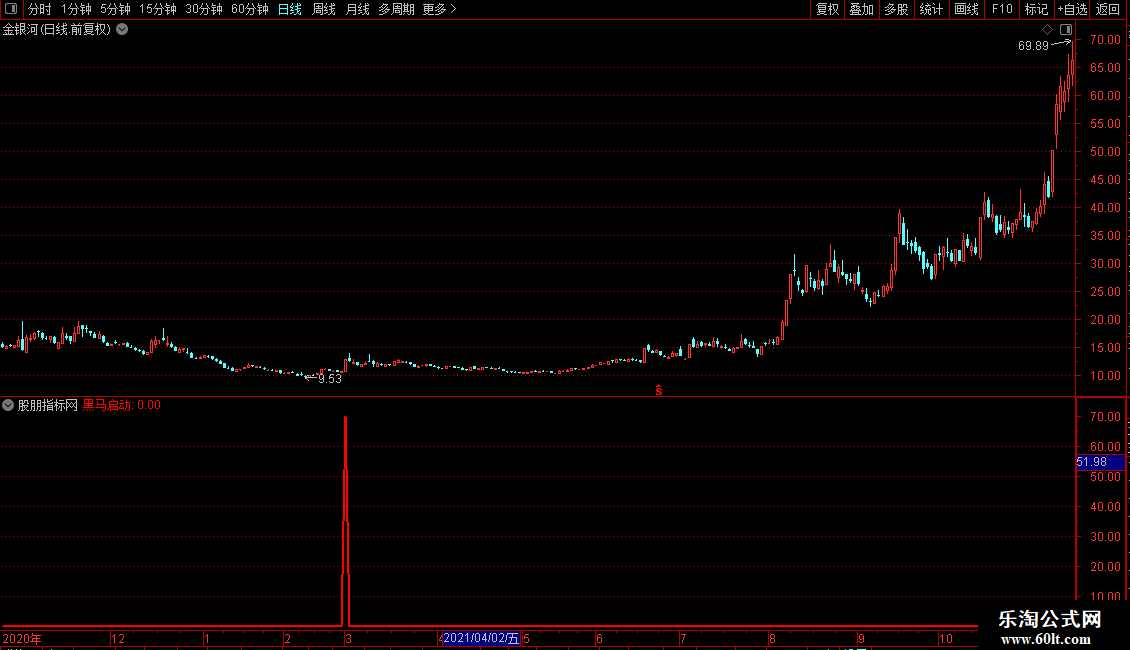 黑马启动:IF(CROSS(行情线,中线止损线) AND C/REF(C,1)>1+0.01*C AND 中线止损线<长线止损线,70,0),COLORRED,LINETHICK2;