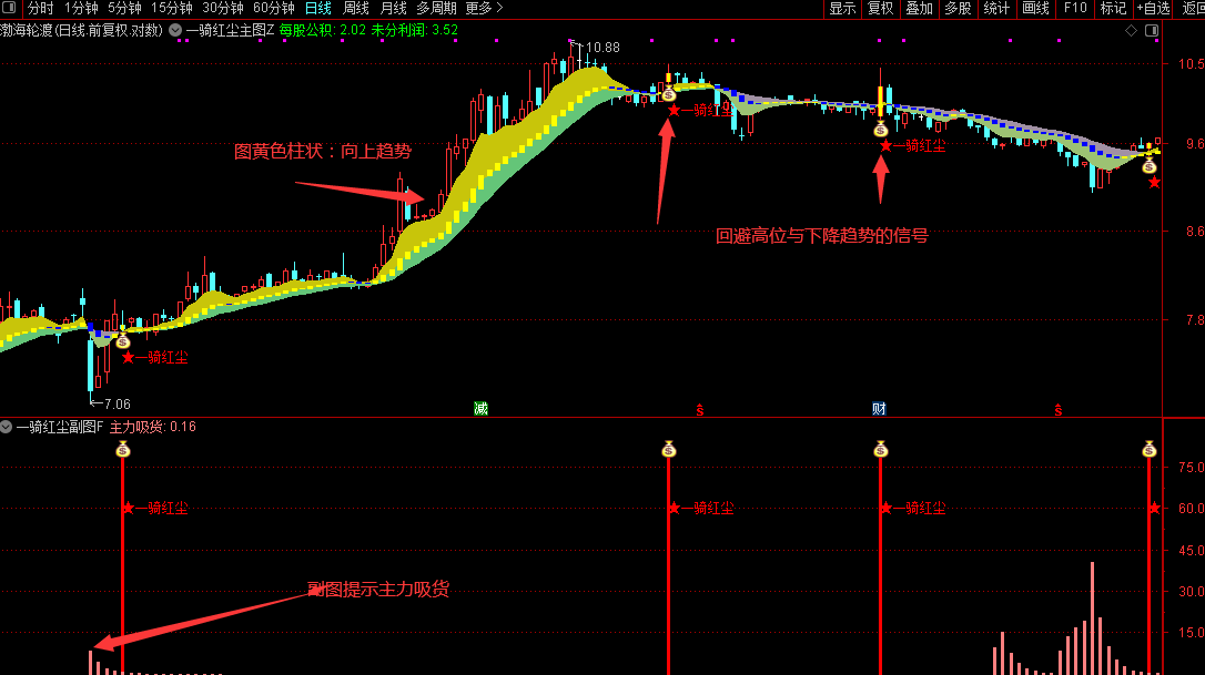1 主图黄色柱提示向上趋势+副图提示有主力吸货,当有主力吸货后出现"一骑红尘"的信号,意味着即将起飞,可低吸介入。