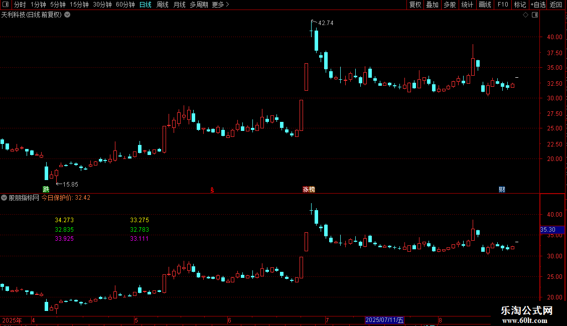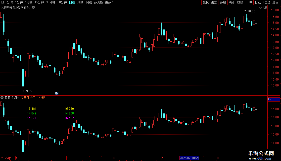 背景:DRAWGBK(C>0,RGB(0,0,0),RGB(0,0,0),0,'预测价',0); DRAWKLINE(H,O,L,C); {预测当天最低价公式} A1:=REF(O,1); A2:=ABS((REF(C,1)-A1)/A1); A3:=ABS((REF(H,1)-A1)/A1); A4:=ABS((REF(L,1)-A1)/A1); B1:=ABS((A2+A3+A4)/3); B2:=O*B1; 预测低一:=O-B2; 预测高一:=O+B2; 今日保护价:(REF(C,2)+REF(C,1)+O)/3 ,COLOR4080FF,NODRAW; 开盘价1:=OPEN; 开盘价2:=REF(OPEN,1); 最高价1:=HIGH; 最高价2:=REF(HIGH,1); 最低价1:=LOW; 最低价2:=REF(LOW,1); 收盘价1:=CLOSE; 收盘价2:=REF(CLOSE,1); AA:=最高价2; BB:=最低价2; CC:=开盘价2; DD:=收盘价2; EE:=(AA+BB+CC+2*DD)/5; AAA:=EE+(AA-BB); BBB:=2*EE-BB; CCC:=2*EE-AA; DDD:=EE-(AA-BB); 上升突破价:=AAA; 上升阻力价:=BBB; 下跌支撑价:=CCC; 下跌反转价:=DDD; EEE:=(EE+上升突破价+上升阻力价+下跌支撑价+下跌反转价)/5; 心理价:=EEE; FFF:=(EEE+开盘价1)/2; GGG:=(预测低一+FFF)/2; 预测低二:=GGG; {预测今日最高价公式} 预测高二:=MA(REF(HIGH,1)/REF(CLOSE,2),N)*REF(CLOSE,1); DRAWNUMBER_FIX(1,0.10,0.20,0,CONST(预测低一)),COLORGREEN; DRAWNUMBER_FIX(1,0.10,0.28,0,CONST(预测高一)),COLORMAGENTA; DRAWNUMBER_FIX(1,0.24,0.20,0,CONST(预测低二)),COLORGREEN; DRAWNUMBER_FIX(1,0.24,0.28,0,CONST(预测高二)),COLORMAGENTA; 买回价:=预测低二*1.015; 卖出价:=买回价*(1+PP); DRAWNUMBER_FIX(1,0.10,0.12,0,CONST(卖出价)),COLORYELLOW; DRAWNUMBER_FIX(1,0.24,0.12,0,CONST(买回价)),COLORYELLOW;