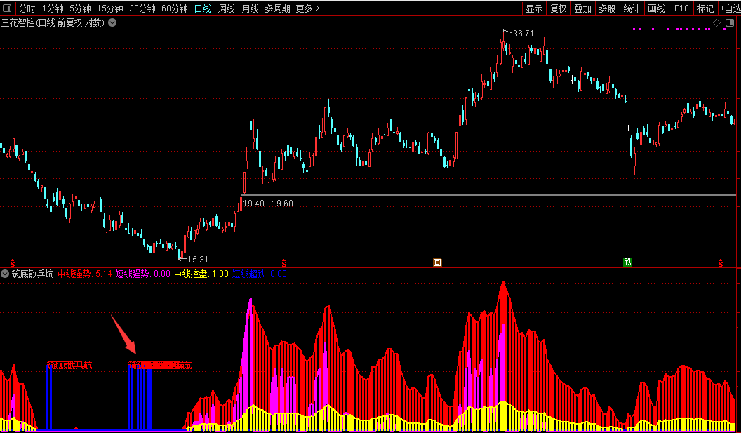 使用时重点关注:当中线强势指标持续走强,同时出现紫色短线强势信号,配合散兵坑筑底形态,即为较佳介入时机。黄色中线控盘线可验证趋势持续性,蓝色短线超跌区域则提示反弹机会。该指标适用于中短线操作,能有效识别主力建仓阶段的特征形态。