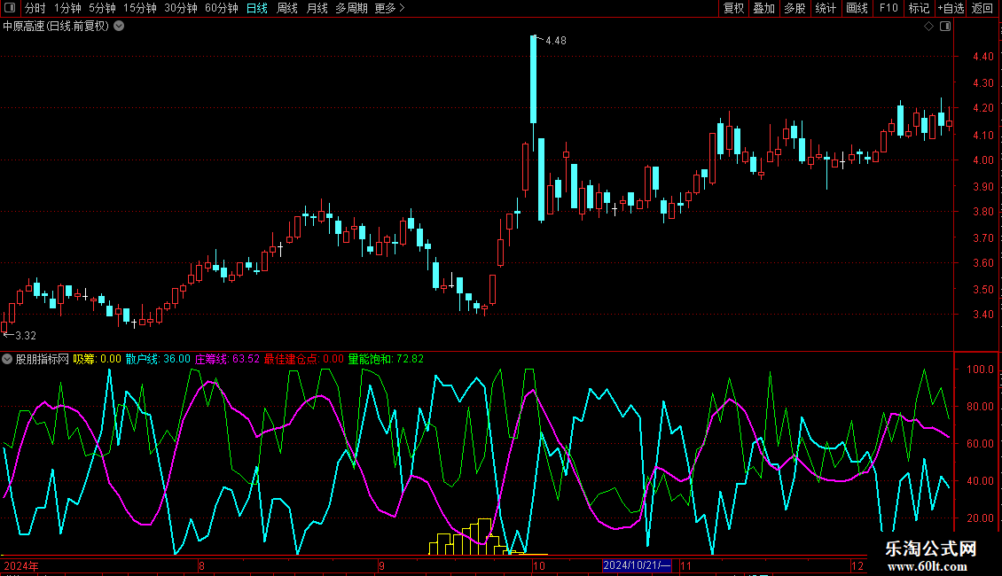 量能饱和:IF((AMOUNT/C)/(HHV(AMOUNT,20)/HHV(C,20))*100>100,100,(AMOUNT/C)/(HHV(AMOUNT,20)/HHV(C,20))*100),COLOR00FF00;