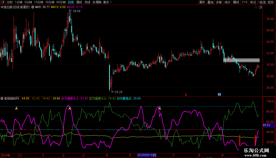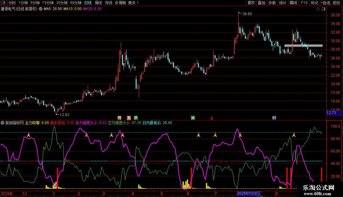 2.紫色主力吸筹线低位震荡配合红色量能柱出现,构成日内见底信号,此时适合分批低吸布局。