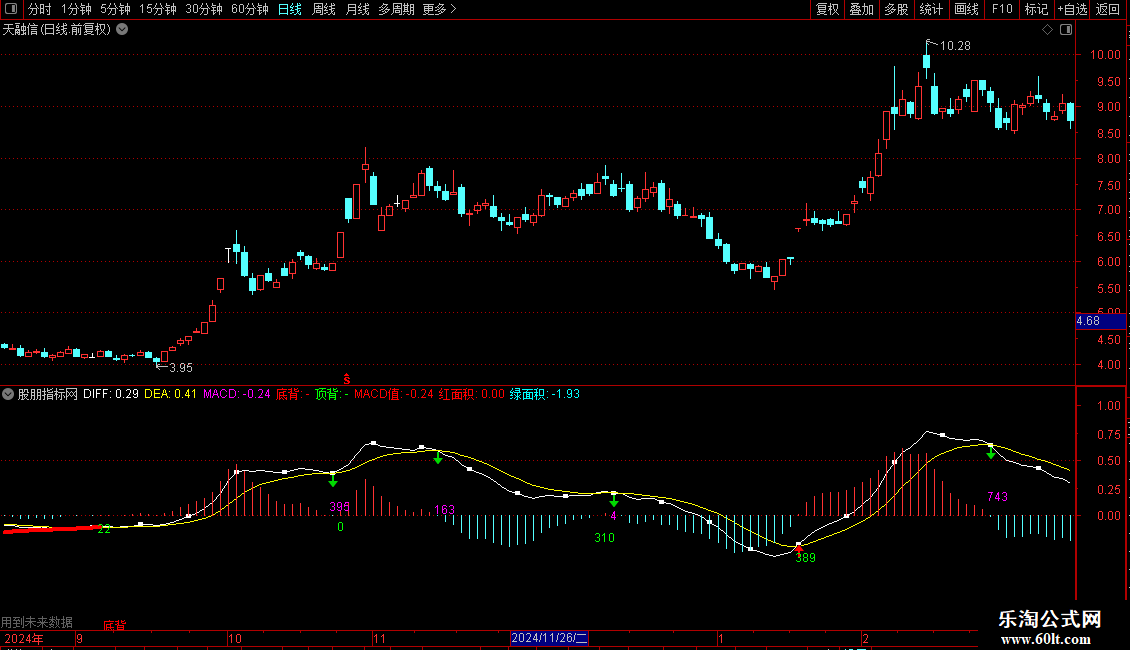 顶背:DRAWLINE(A2=0,DEA,顶背离,DEA,0),COLORGREEN,LINETHICK4;
