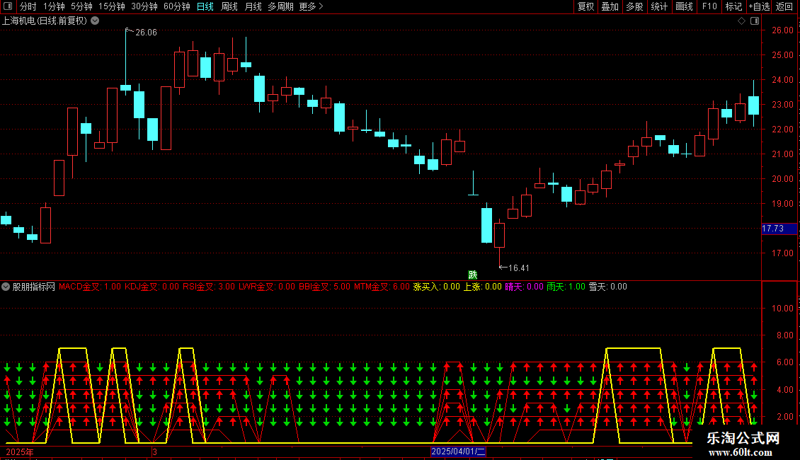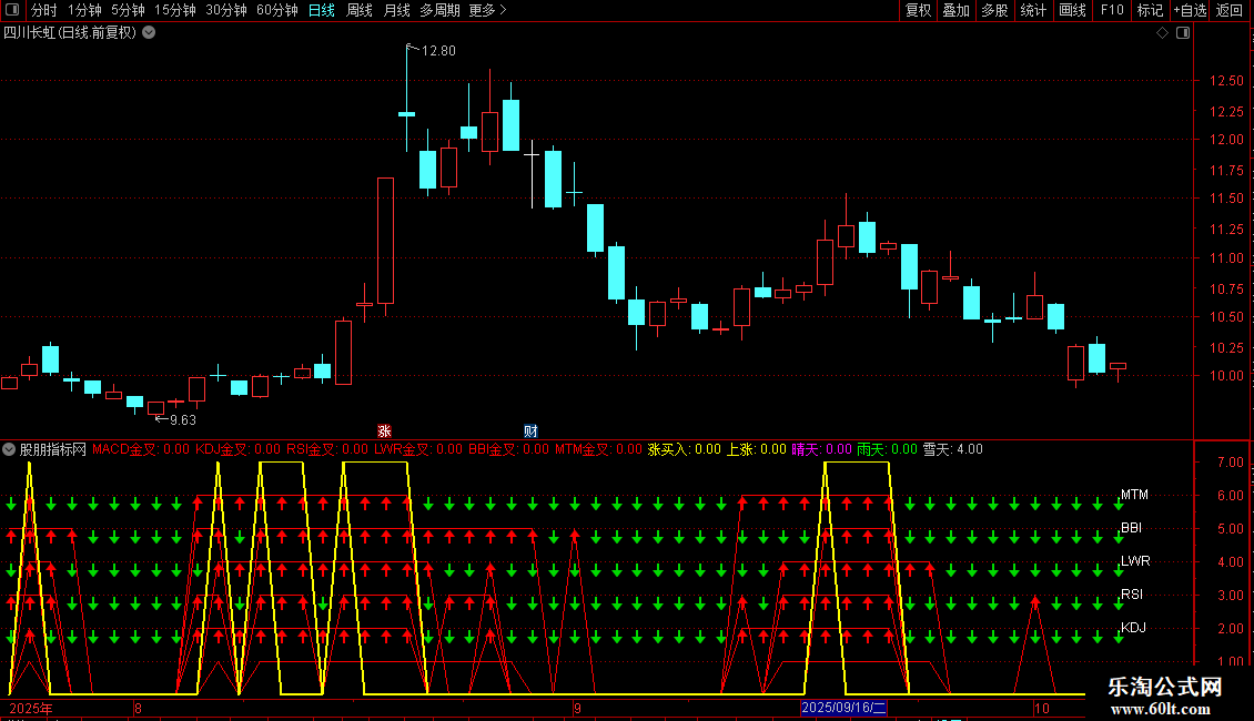 雨天:BARSLASTCOUNT(MACD金叉+KDJ金叉+RSI金叉+LWR金叉+BBI金叉+MTM金叉>0 AND MACD金叉+KDJ金叉+RSI金叉+LWR金叉+BBI金叉+MTM金叉<21 ),LINETHICK0;