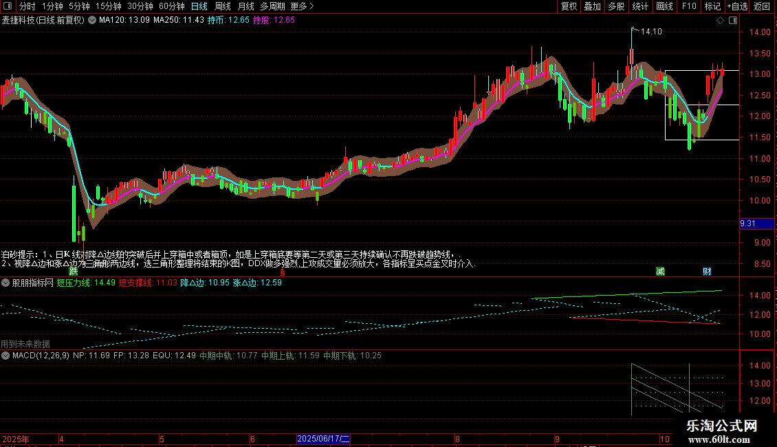 DRAWTEXT_FIX(ISLASTBAR,0,0.92,0,'泊砂提示:1、日K线对降△边线的突破后并上穿箱中或者箱顶,如是上穿箱底要等第二天或第三天持续确认不再跌破趋势线,.'),COLORWHITE;