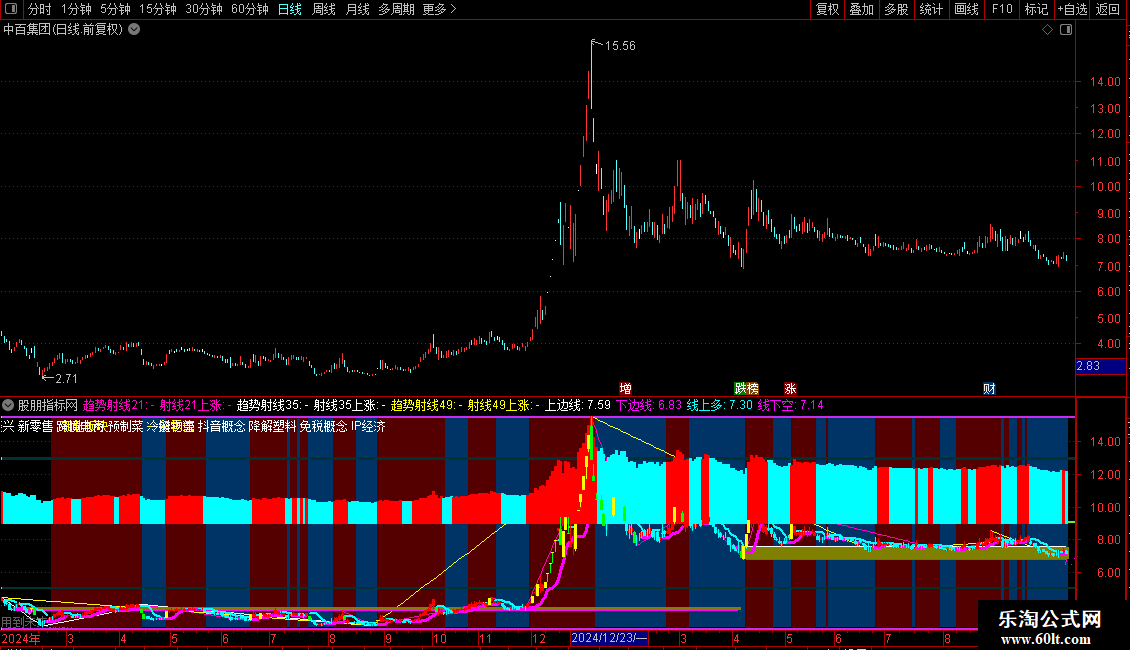 趋势射线49: DRAWLINE(H=HHV(H,49),H,L=LLV(L,49),L,0),COLORYELLOW;