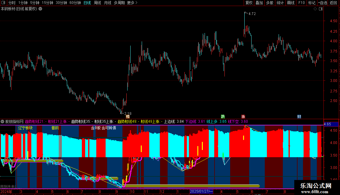 射线35上涨: DRAWLINE(L=LLV(L,35),L,H=HHV(H,35),L,0),COLORWHITE;