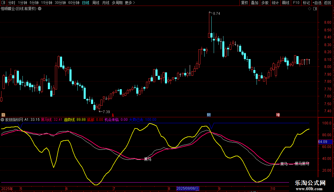 黑马线:EMA(A1,5),LINETHICK2,COLOR6600FF;
