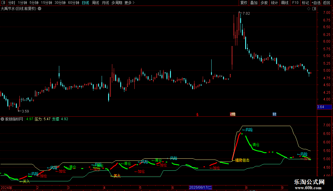 DRAWTEXT(减仓,HIGH*1.02,'←风险'),COLORCYAN;