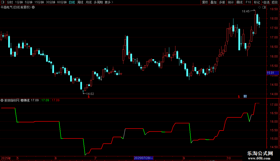 IF(楼梯线<=REF(楼梯线,1),楼梯线,DRAWNULL),COLORGREEN,LINETHICK2;