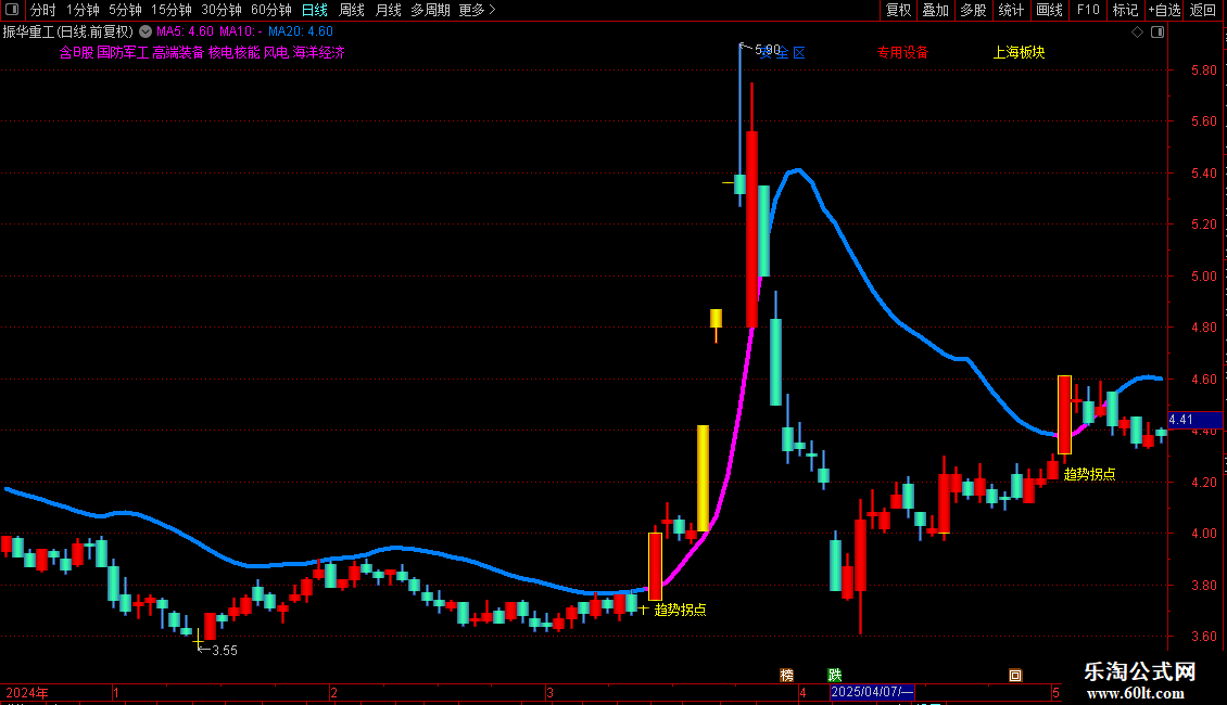 指标特别设计了“趋势拐点” 提示功能。当开盘价低于WEKR线而收盘价强势上穿,并且当日涨幅超过7%时,会在K线下方标记“趋势拐点”文字,同时用黄色K线突出显示。这通常意味着强势突破的启动信号,是投资者重点关注的机会。