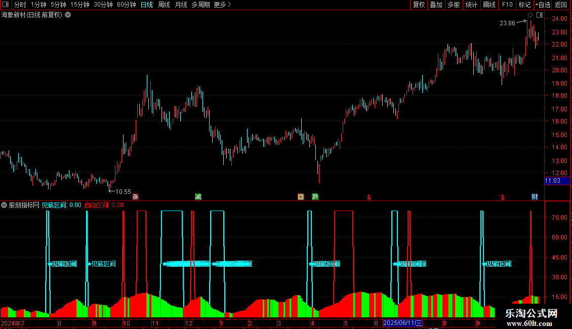 指标通过计算价格在近期高低点之间的相对位置,判断股票的底部和启动信号。主要功能是识别两种关键时机:当股价长期弱势后出现企稳迹象时标记为“见底区间”;当股价连续走强且动量充足时标记为“启动区间”。操作策略是在见底区间关注潜在反转机会,在启动区间考虑跟进。