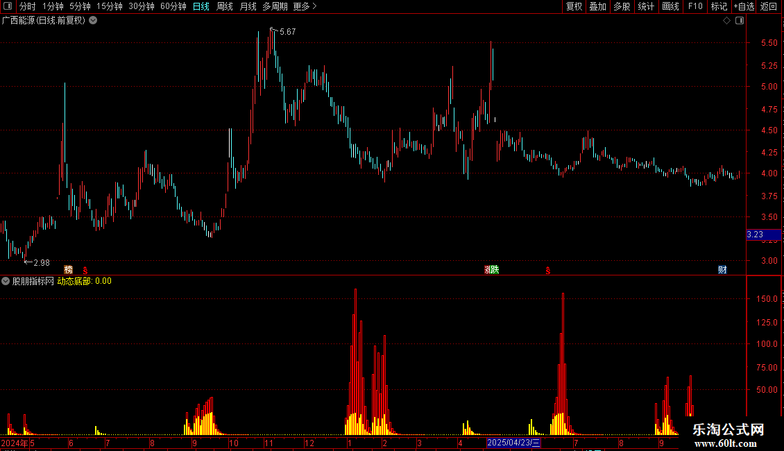动态底部:EMA(IF(L<= LLV(L,30),SMA(ABS(L-REF(L,1)),30,1)/SMA(MAX(L-REF(L,1),0),30,1),0),3)*10,STICK,COLORYELLOW,LINETHICK2;