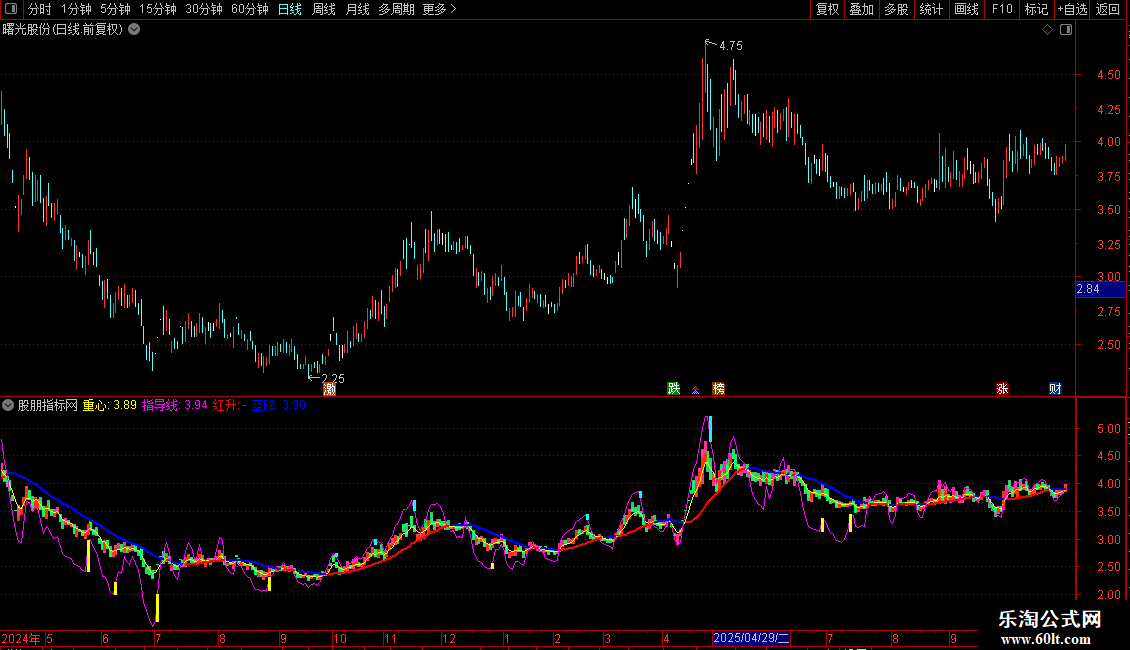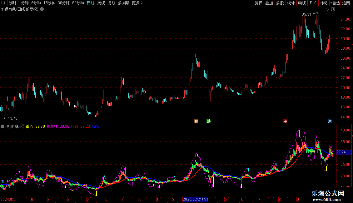 指导线:重心+GAO*(RSI-0.5),COLORMAGENTA,LINETHICK1;