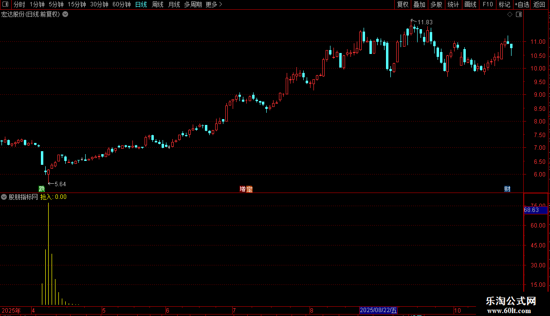 抢入:EMA(IF(LOW<=VARE,(VARD+VARF*2)/2,0),3)/618*VAR10,COLORYELLOW,STICK;
