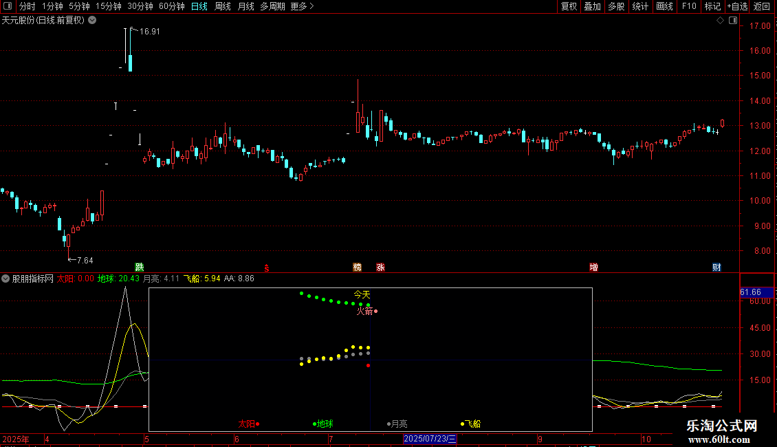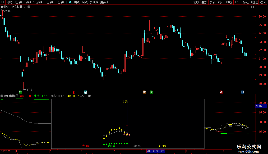 DRAWTEXT_FIX(CURRBARSCOUNT=7,0.44,0.5-0.02*REF(地球,6),1,'●'),COLORGREEN;
