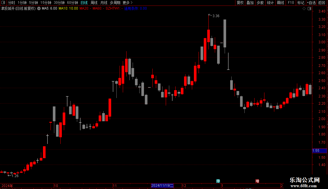 上升斜线:DRAWLINE(CURRBARSCOUNT=CONST(DQD1)+1,CONST(HQD1),ISLASTBAR,CONST(TTT),0),COLORWHITE,DOTLINE,LINETHICK1;{上升斜线};