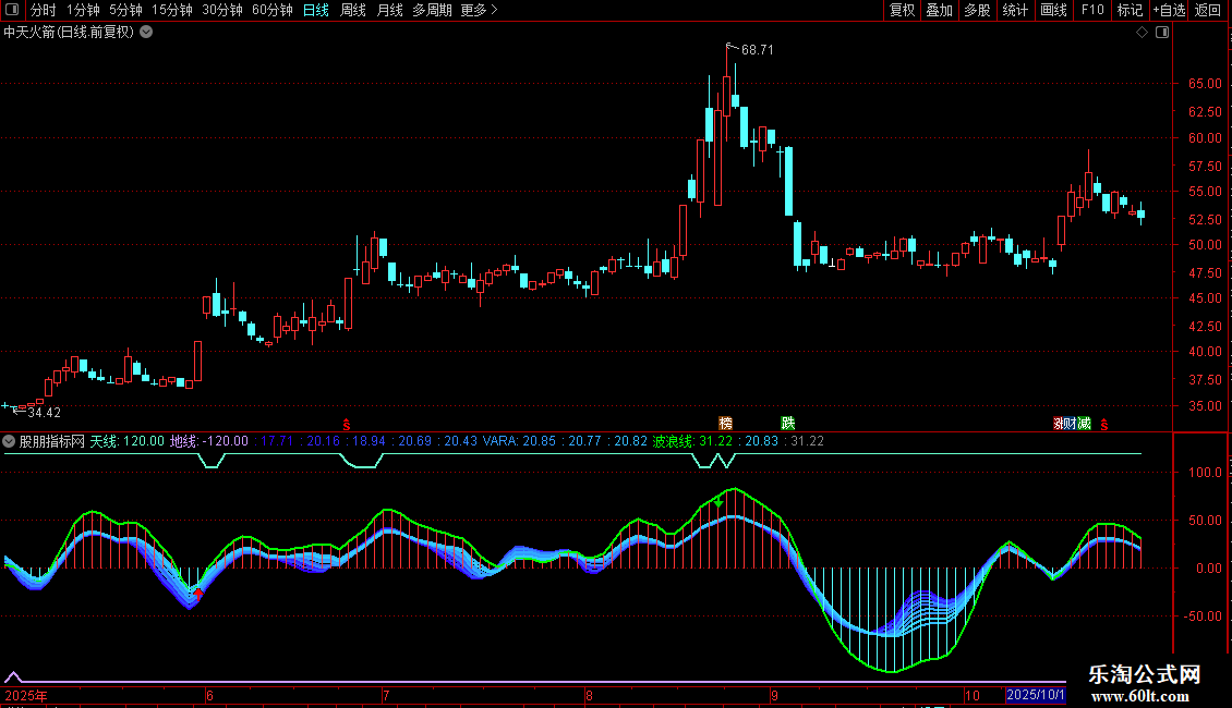 波浪线:SMA((VAR11-50)*2,3,1)+SMA((VAR10-50)*2,3,1)/2,LINETHICK2,COLORGREEN;