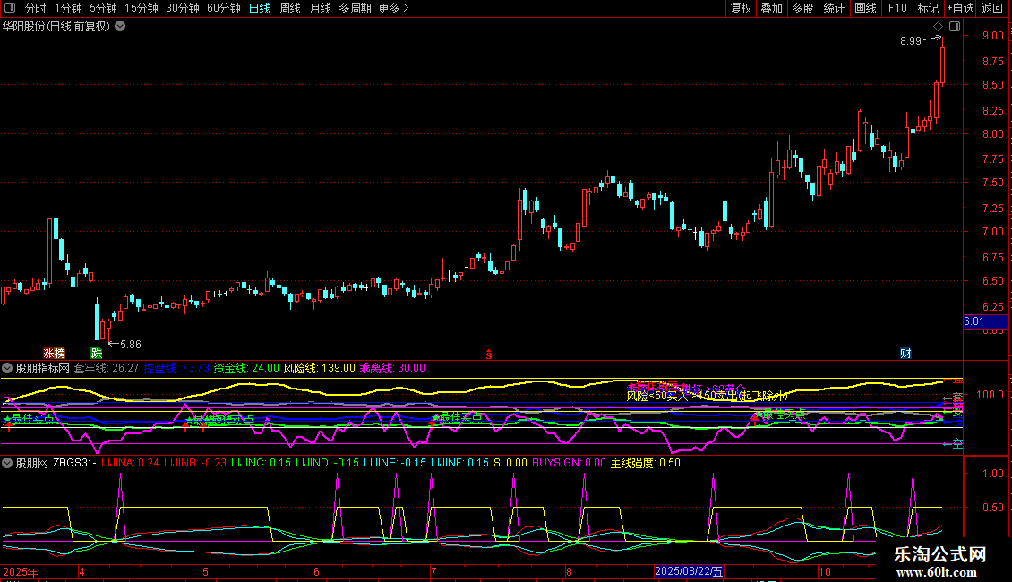 幅图指标是通达信兼容的画线类综合分析工具,围绕 “筹码状态、主力控盘、资金强度、风险等级、趋势乖离” 五大核心维度,通过信号线、分界线和动态标注,量化市场多空力量,提供明确的买卖点和仓位管理规则,适用于日线级别波段操作。