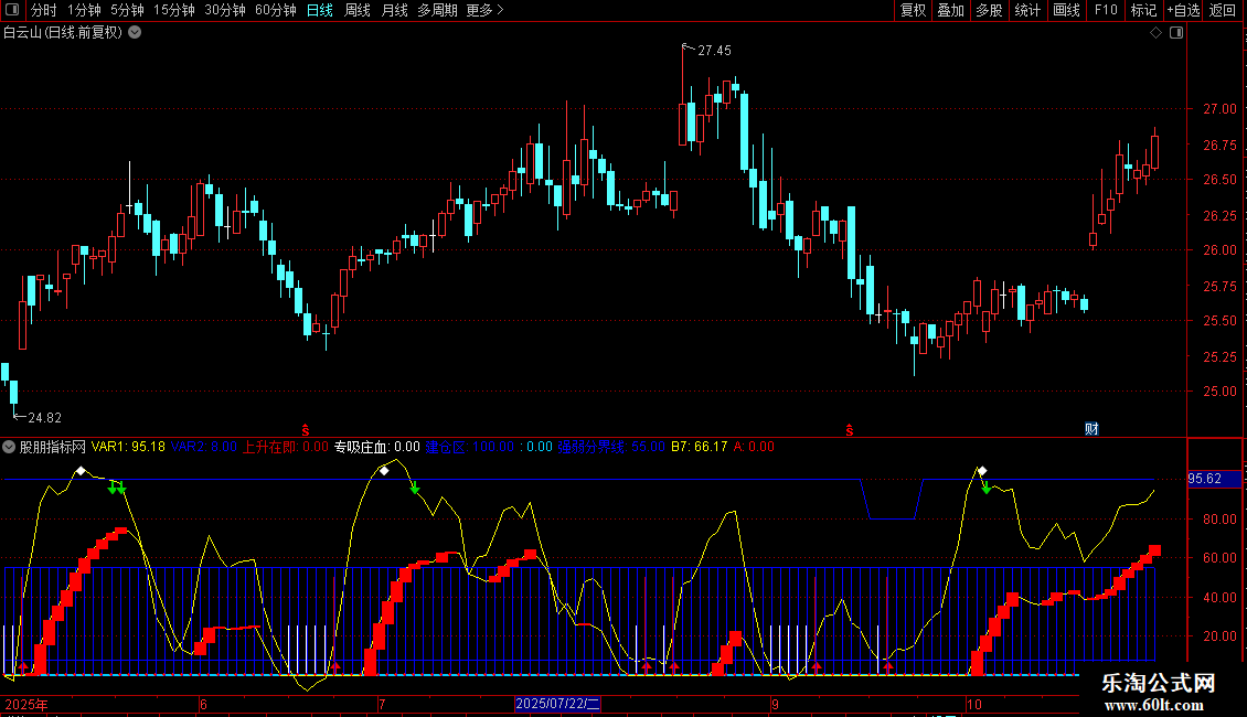 上升在即: IF(CROSS(VAR1,VAR2),50,0),STICK,COLOR0000CC,LINETHICK2;
