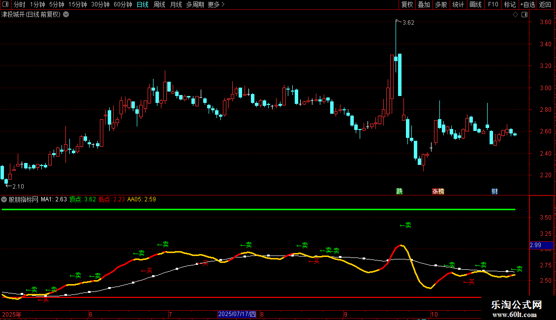 DRAWTEXT(REF(C,1)>D1 AND C<D1 AND D1>REF(D1,1),H*1.02, '←卖'),COLORGREEN;