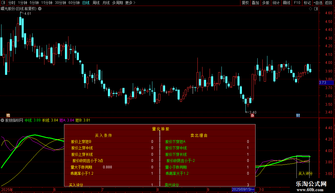 卖出评分:=T7+T8+T9+T10+T11+T12;DRAWNUMBER_FIX(CURRBARSCOUNT=1,0.78,0.95,1,卖出评分);