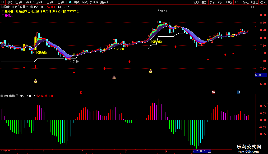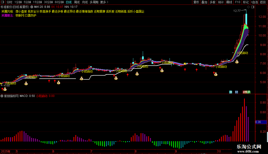 2.核心逻辑解析:主图小阳启动信号与副图红色量能柱形成双重验证。首次共振时,量能柱变红且主图出现启动信号,